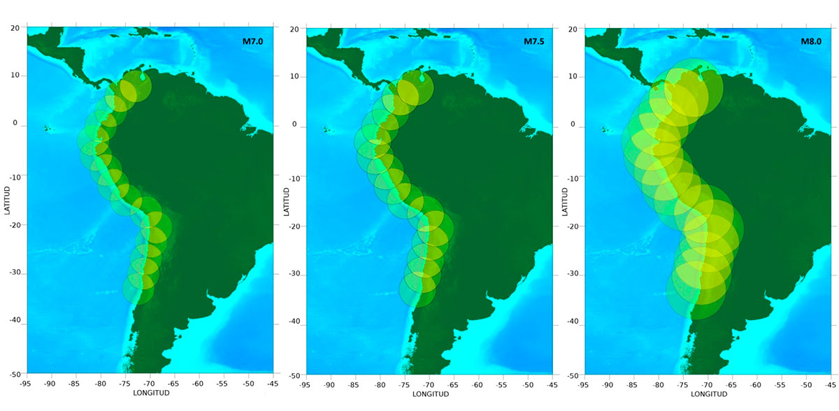 Las ubicaciones de los 15 CI de 667, 427 y 380km de radio para M8.0, M7.5, y M7.0 respectivamente se muestran en la Figura 2.